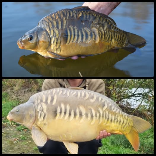 Al jaren kweken we onze eigen karpers en niet zonder succes. Deze hele fijne rijenkarper is geboren in 2020. De bovenste foto was eind 2021, de onderste foto oktober 2025.